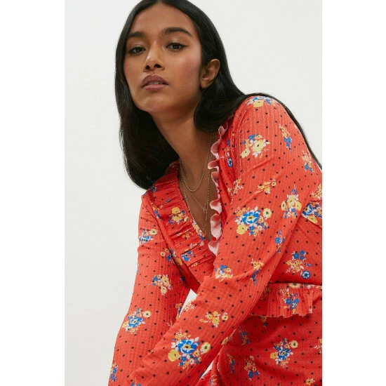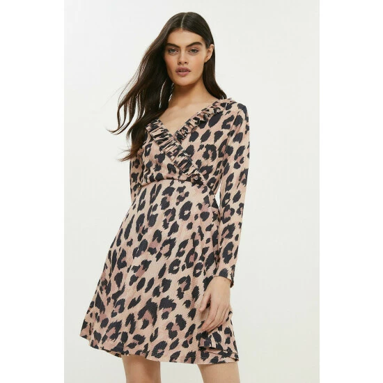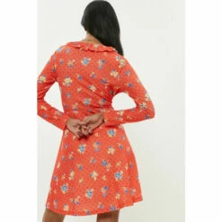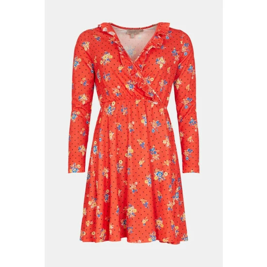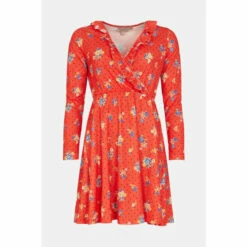 Flirtatious frills add a playful touch to this floral-print mini dress. Fitted with a flattering wrap front and flared skirt, this chic crinkle jersey number will go straight to the top of your summer wish list.Style: A-Line DressFabric: JerseyLength: MidiNeckline: CrewSleeve Length: Sleeveless