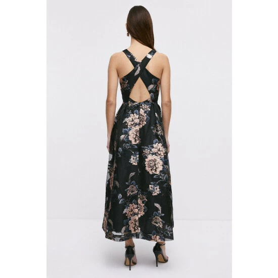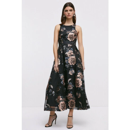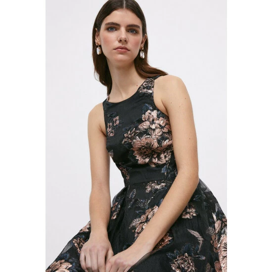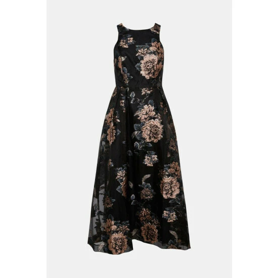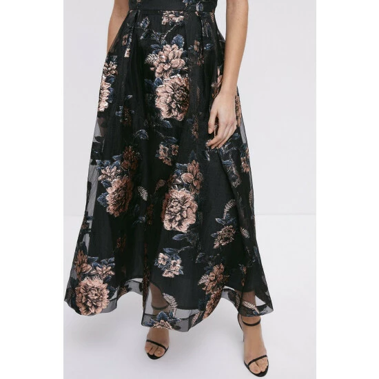Main: 84% Polyester, 16% Metallic Fibre. Lining: 100% Polyester. Dry Clean Only. Length 136cm.