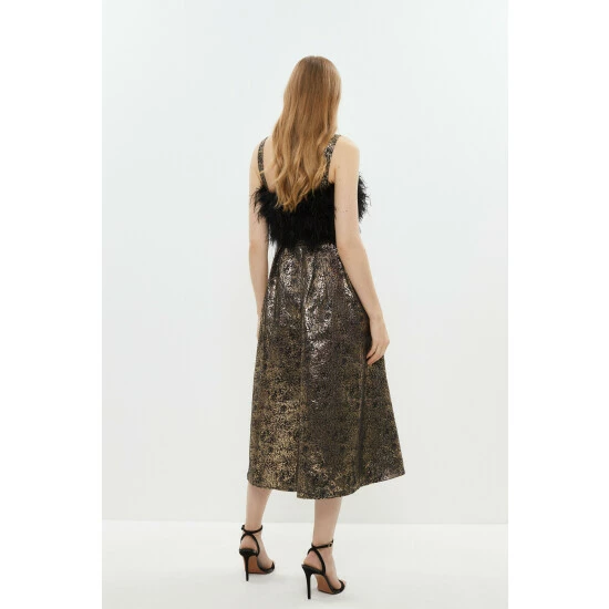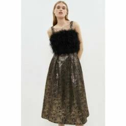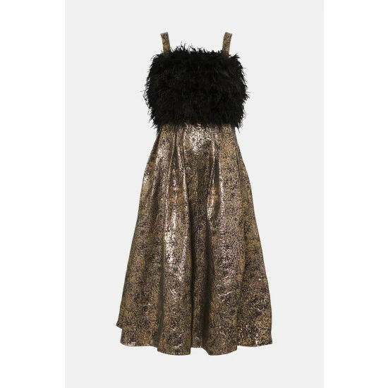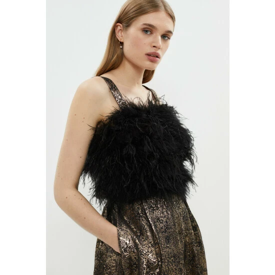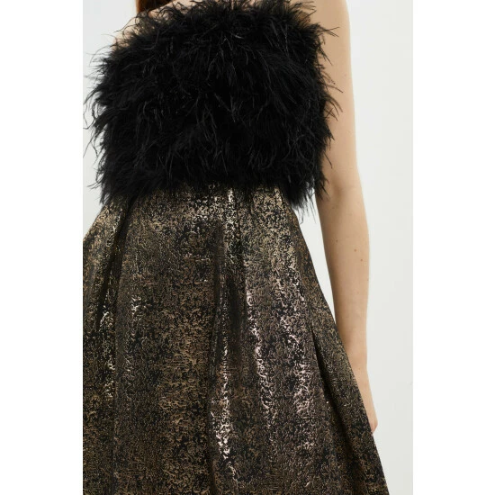 Main: 85% Polyester, 15% Cotton. Contrast: 100% Polyester. Lining: 100% Polyester. Trim: Feathers. Dry Clean Only. Length 124cm.