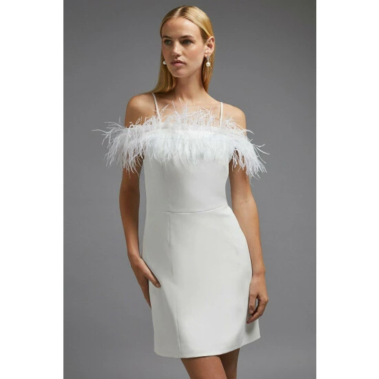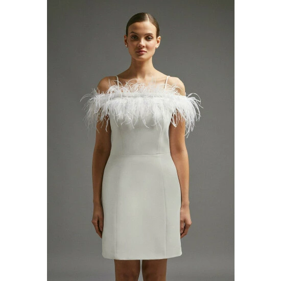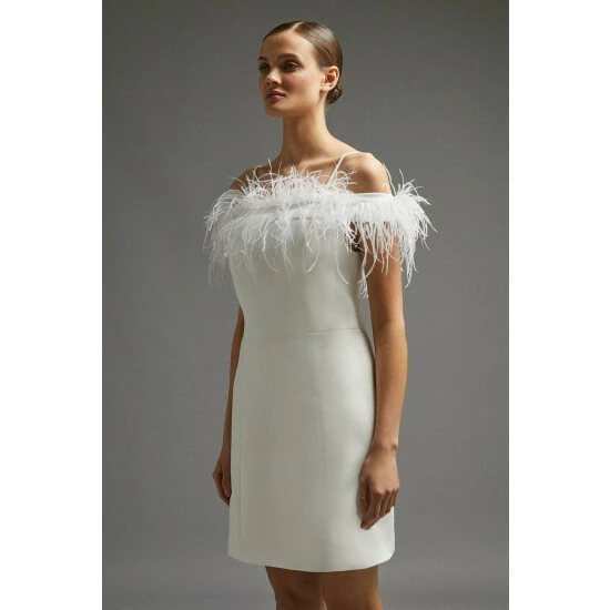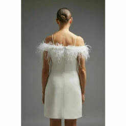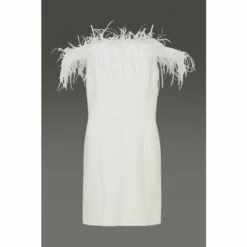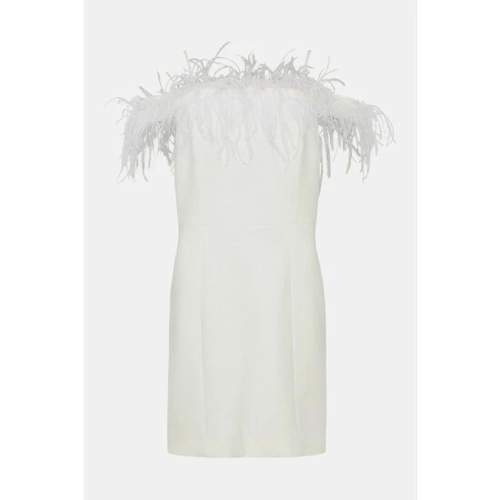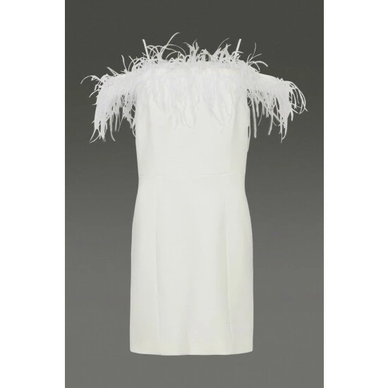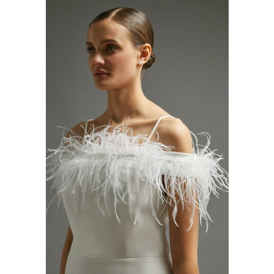 92cmdry clean onlymain 89% polyester 11% elastane lining 100% polyester trim 100% ostrich feathers. Dry clean only