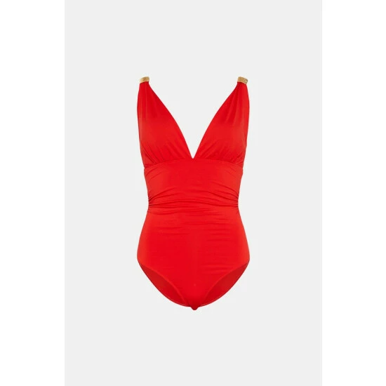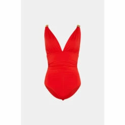 Seeking out sultry new swimwear? Take the plunge with this striking lipstick-red style. Detailed with a plunging V-neckline and full coverage bottoms, this sophisticated swimsuit is sure to stand out at the beach or pool. Trimmed with Grecian-inspired gold trims at each strap, it makes an inspired choice for all your summer adventures.Style: SwimsuitFabric: SwimNeckline: Plunge