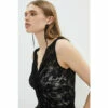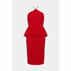 Exquisitely enveloping the form, this lace pencil dress combines a flirtatious peplum waistline with slim halter-neck straps that tie at the back of the neck. The sleek pencil skirt hugs curves beautifully to guarantee a leg-lengthening finish – just add heels.Style: Pencil DressDesign: PlainFabric: LaceLength: MidiNeckline: HalterneckSleeve Length: Sleeveless