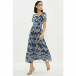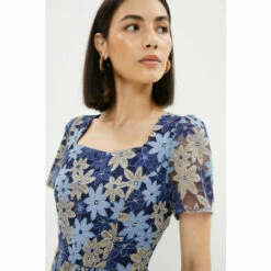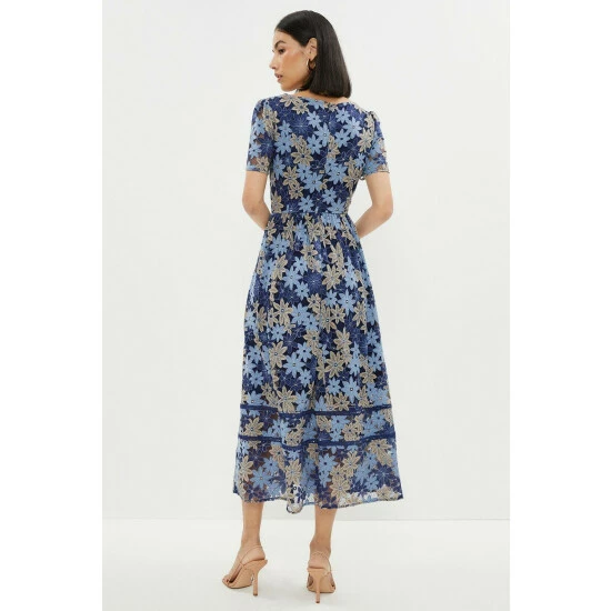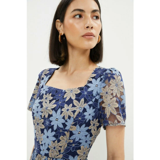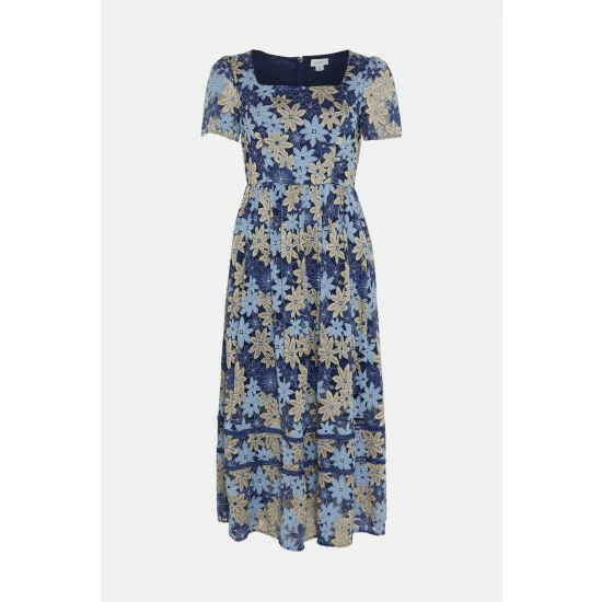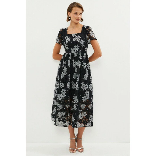 Don’t save feminine floral prints for spring. Intricately blooming with lace daisies, this short-sleeved midi dress makes a wonderfully ladylike choice for winter soirees. It features a sharply cut square neckline, nipped-in waist and flowing skirt that hits the leg mid-calf for a thoroughly demure finish.Style: Fit & Flare DressFabric: LaceLength: MidiNeckline: SquareSleeve Length: Short Sleeve