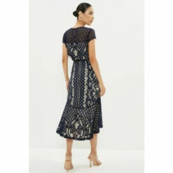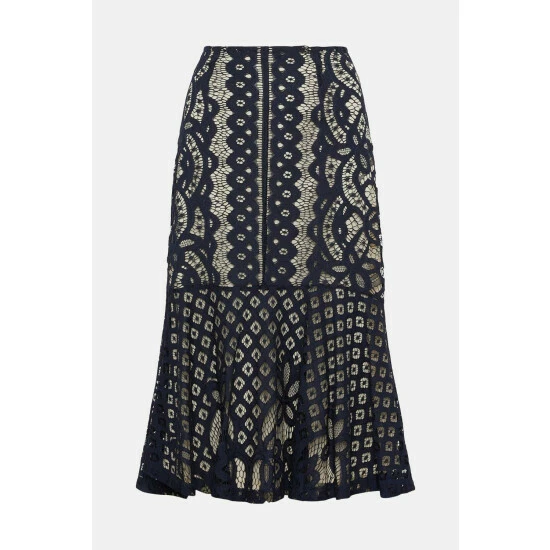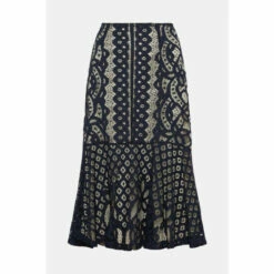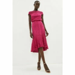 Co-ords with a romantic twist – this gorgeous lace skirt shows off an asymmetric peplum hemline for a beautiful sense of swish. Hugging the figure with its high-waisted fit, it pairs perfectly with the matching cap-sleeve top.Style: Pencil SkirtDesign: PatternedFabric: LaceLength: Midi