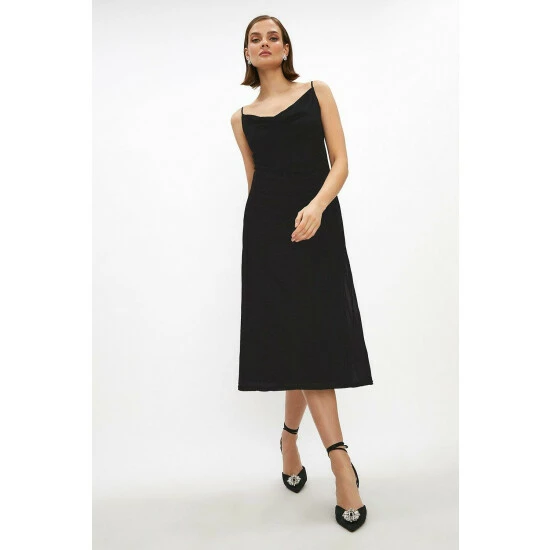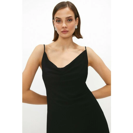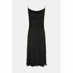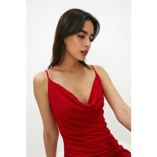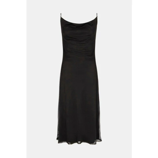 A ’90s-style cowl neckline adds impactful allure to this simply cut mesh midi dress. Its slim straps and draped silhouette make it an understated – but always elegant – choice for after dark.Style: Slip DressDesign: PlainFabric: MeshLength: MidiNeckline: CowlSleeve Length: Strappy