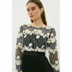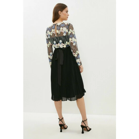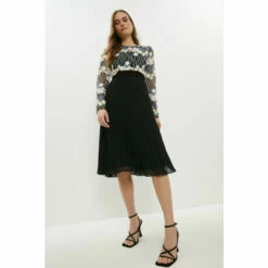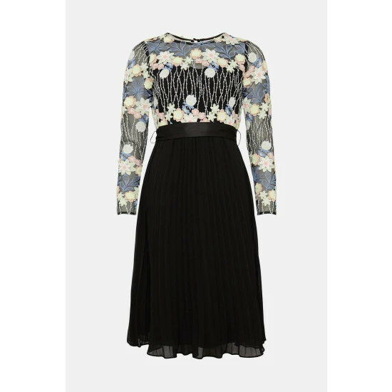Style: Fit & Flare DressFabric: MeshLength: MidiNeckline: CrewSleeve Length: Long Sleeve
