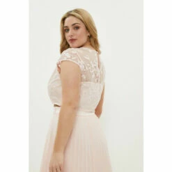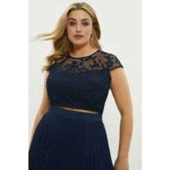 Fashion-forward bridesmaids are sure to adorn this seductive separate. Showing off a flirty cropped cut and elegant floral embroidery, this cap-sleeved top makes a modern alternative to traditional wedding wear when paired with the coordinating pleated midi skirt.Expertly designed for those size 18 and above, our plus size collection is perfectly proportioned to ensure you look stylish at every shape.Style: DressDesign: PlainFabric: LaceSleeve Length: Cap Sleeve