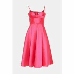 Think pink. An exquisite construction of satin with a seamed bodice that sculpts the bust, this striking party dress continues our love affair with a truly beautiful hue. Offset the romantic fit-and-flare silhouette and full skirt with chunky, ’70s-style platforms in a matching pop of hot-pink.Style: Skater DressDesign: FloralFabric: TwillLength: MidiNeckline: CowlSleeve Length: Strappy